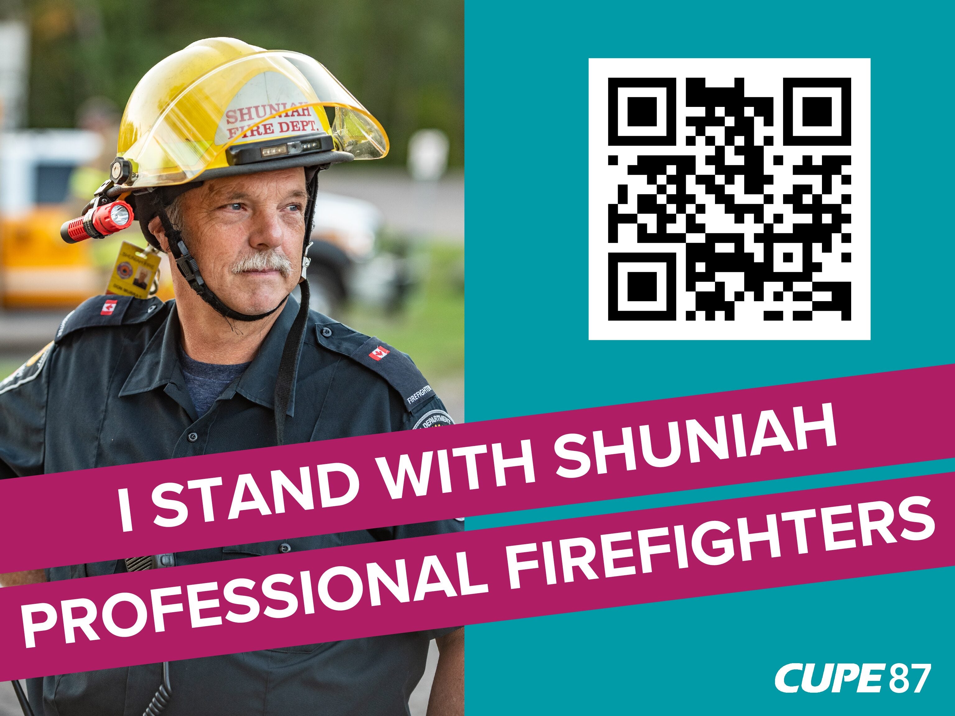 CUPE and the Shuniah Professional Volunteer Firefighters want the Employer, the Residents of Shuniah to know they are asking for reasonable wages to compensate for the dangerous work they do to protect the very Community they live in. Please reach out to Mayor and Council of Shuniah and tell them to bargain a fair wage for the men and women who protect Shuniah.